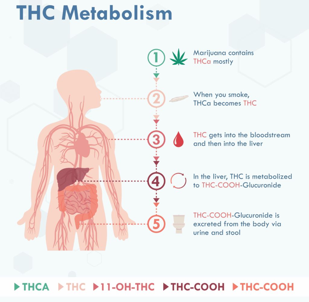 THC is a lipid-soluble compound that binds to fats in the body. After cannabis use, THC is metabolized by the liver into THC-COOH and other metabolites, which then get stored in adipose (fat) tissue